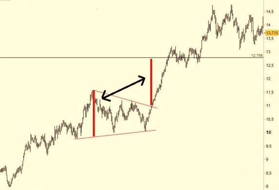 Tak więc pierwszy cel wzrostu zostałby osiągnięty poprzez przyjęcie amplitudy trójkąta i rzutowanie go w górę od przełamania trójkąta.