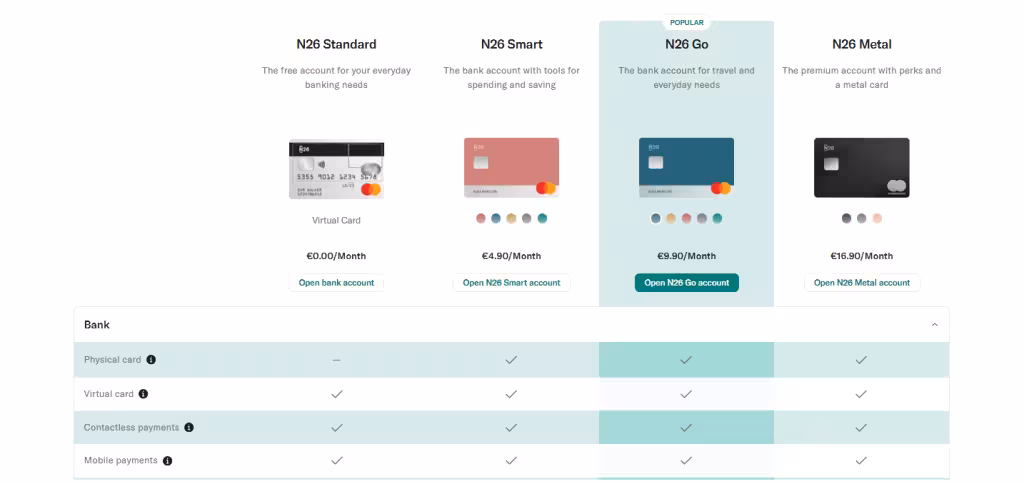 W N26 podstawą jest konto Standard, które można prowadzić bez miesięcznej opłaty. Użytkownik otrzymuje kartę wirtualną, a karta fizyczna jest dodatkowo płatna (około 10 euro jednorazowo). Wersja darmowa obejmuje podstawowe funkcje bankowe, ograniczoną liczbę bezpłatnych wypłat z bankomatów oraz standardowe limity.