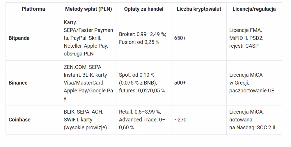 Bitpanda vs Coinbase vs Binance to jeden z najczęściej zadawanych dylematów wśród inwestorów z Polski w 2026 roku. Wybór platformy przestaje być tylko kwestią opłat – coraz większe znaczenie mają regulacje MiCA, dostęp do BLIK i realne koszty transakcji.