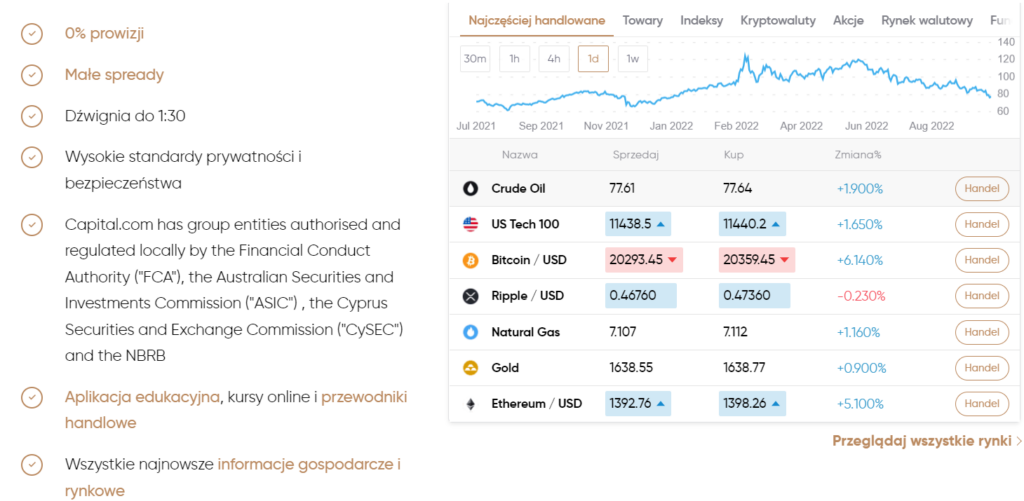 Strona Capital.com oferuje również szeroki zakres aktywów, zapewniając wiele opcji handlowych. Ponadto, broker jest wysoce regulowany. Należy wspomnieć, że broker nie jest dostępny dla klientów z USA i pobiera opłaty za rollover od swoich handlowców. Mimo to, Capital.com należy do najlepszych w branży pomimo tych drobnych wad.
