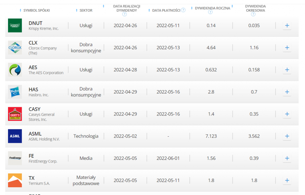 Kalendarz dywidend eToro odzwierciedla wszystkie istotne dane dotyczące przewidywanych w najbliższej przyszłości dywidend, pokazując daty niewypłacania i wypłacania dywidend, kwotę pieniężną każdej dywidendy na akcję, nazwę spółki i sektor. Akcje dywidendowe są sortowane według kapitalizacji rynkowej i można je wyszukiwać według nazwy spółki, symbolu lub daty, jak w poniższym przykładzie.