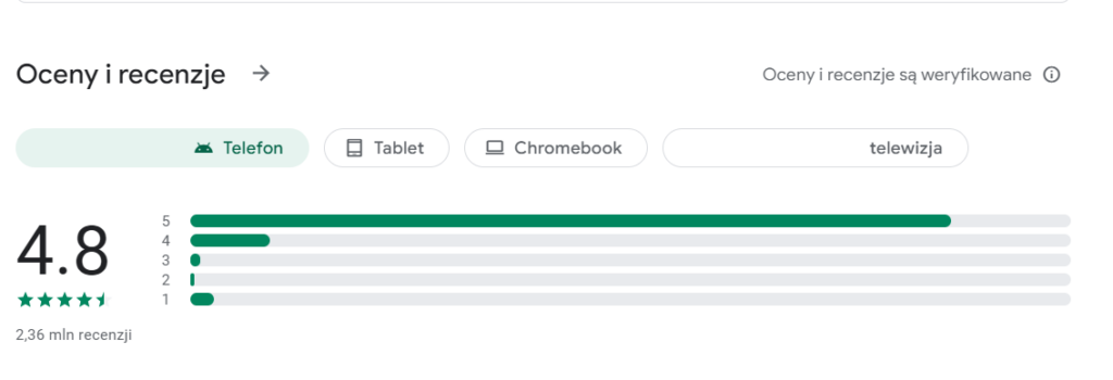 Natomiast w Apple App Store uzyskał wysoką ocenę 4.9 gwiazdki. To potwierdza, że użytkownicy bardzo pozytywnie oceniają tę aplikację i doceniają jej funkcjonalność oraz użyteczność.