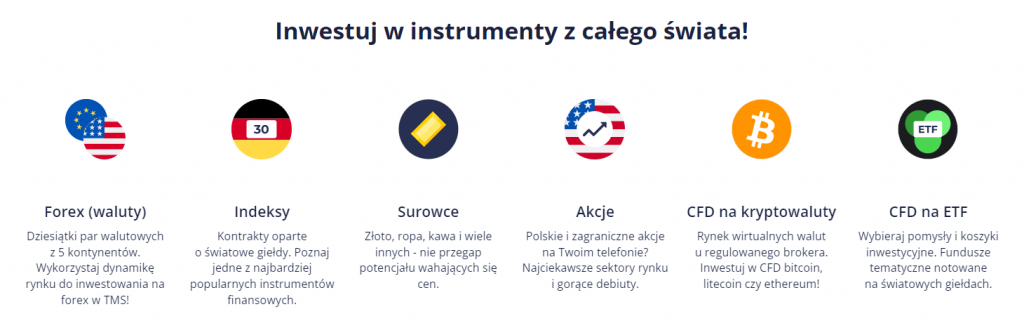 Broker oferuje ponad 3000 instrumentów finansowych, w tym forex, indeksy, surowce, akcje (polskie i amerykańskie), kryptowaluty oraz CFD na ETF-y.