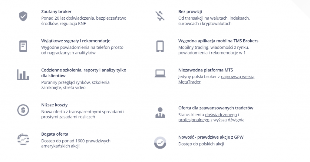 Dzięki mobilnej aplikacji TMS, inwestorzy otrzymują bieżące rekomendacje i prognozy forex, przygotowywane przez nagradzanych analityków. Otwarcie rachunku jest darmowe, a handel odbywa się bez prowizji. Broker wyróżnia się transparentnością, publikując historię wąskich spreadów, co czyni go jednym z najbardziej konkurencyjnych brokerów na rynku.