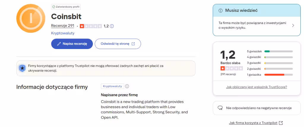 Ocena 1,2/5. Aż 70% opinii to 1 gwiazdka, a tylko 19% użytkowników wystawia maksymalną ocenę. Wiele komentarzy dotyczy braku możliwości odzyskania pieniędzy. Platforma nie odpowiada na negatywne recenzje, co dodatkowo podważa jej wiarygodność. Trustpilot stosuje nawet etykietę ostrzegającą o potencjalnym ryzyku inwestycyjnym.