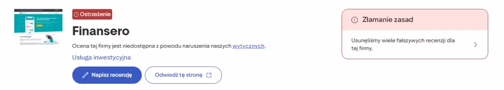 Na platformie Trustpilot profil Finansero jest oznaczony ostrzeżeniem, a ocena firmy została ukryta z powodu naruszenia wytycznych serwisu. Trustpilot informuje również, że usunięto wiele fałszywych recenzji dotyczących tej firmy. Wśród dostępnych opinii widać duże rozbieżności – około 67% stanowią oceny jednogwiazdkowe, podczas gdy pozytywne recenzje to około 29% wszystkich opinii. Część najnowszych komentarzy wygląda na spam lub reklamy usług odzyskiwania kryptowalut, co dodatkowo utrudnia ocenę rzeczywistej reputacji brokera.