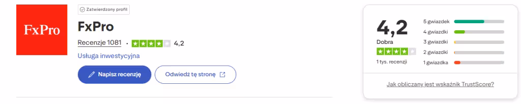 Na Trustpilot FxPro ma ocenę 4,2/5 na podstawie ponad 1 000 recenzji. Ponad połowa użytkowników wystawia maksymalną ocenę, chwaląc przede wszystkim szybkość realizacji zleceń oraz pomocny support.