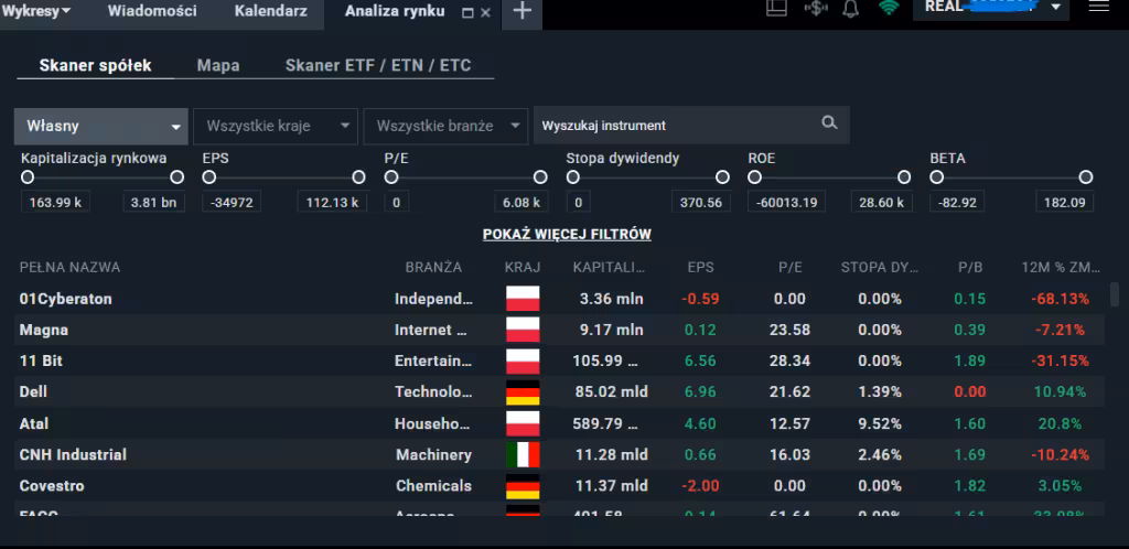 💡 Na platformach inwestycyjnych, takich jak XTB, możesz ustawić te filtry jednym kliknięciem i od razu zobaczyć listę dopasowanych spółek — od Tesli po PZU.
