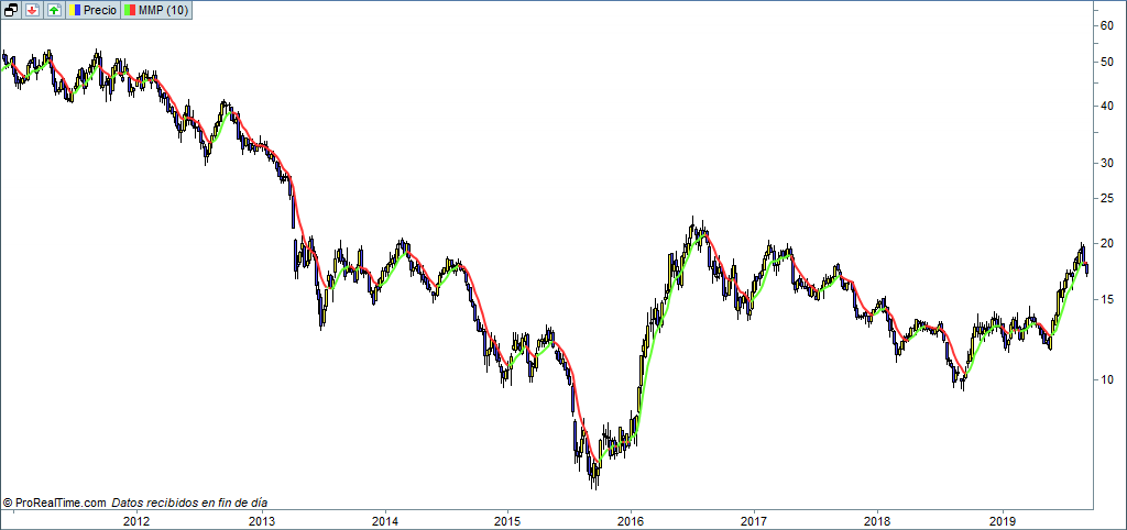 Bierze pod uwagę historię ceny, która zmieniała się w ciągu ostatnich kilku transakcji. Średnia ruchoma pomaga traderowi zidentyfikować poziomy wsparcia i oporu. Prosta średnia ruchoma jest typową średnią arytmetyczną ceny. Otrzymuje się ją poprzez zsumowanie cen zamknięcia z N okresów czasowych i podzielenie otrzymanego wyniku przez N.