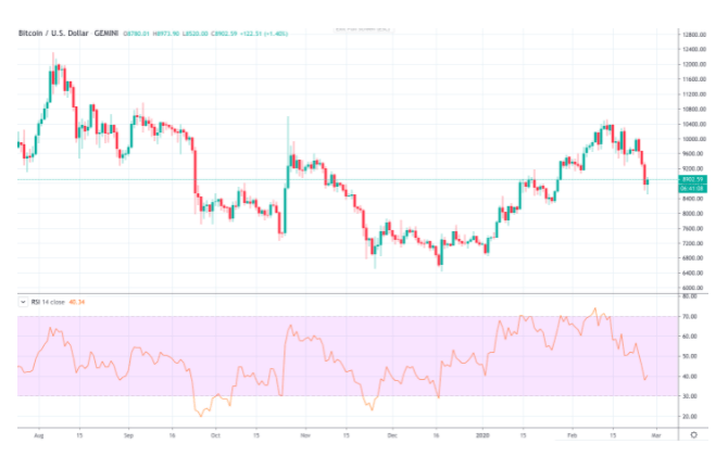 2) RSI większy niż 70, w tym przypadku mamy do czynienia z sytuacją wykupienia, która może wkrótce dać początek niedźwiedziemu odwróceniu.