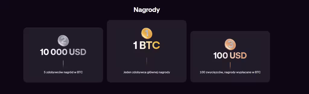 - 1 BTC dla zwycięzcy + 60 000 USD w BTC dla pozostałych