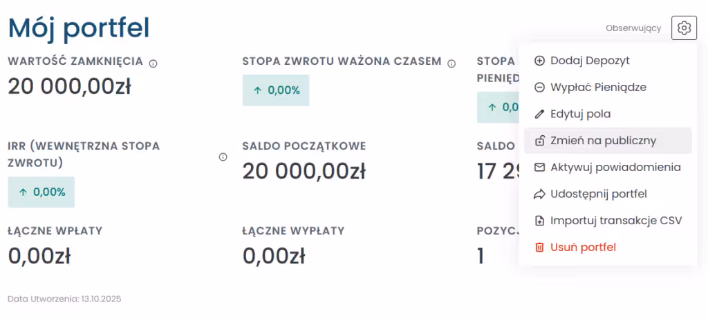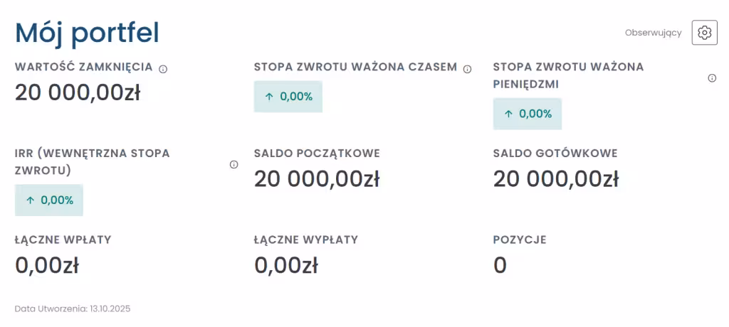 Po wypełnieniu pól zatwierdź utworzenie portfela. Twój portfel pojawi się natychmiast – z wpisanym saldem początkowym i wszystkimi wskaźnikami (rentowność, wpłaty, wypłaty) ustawionymi na zero.