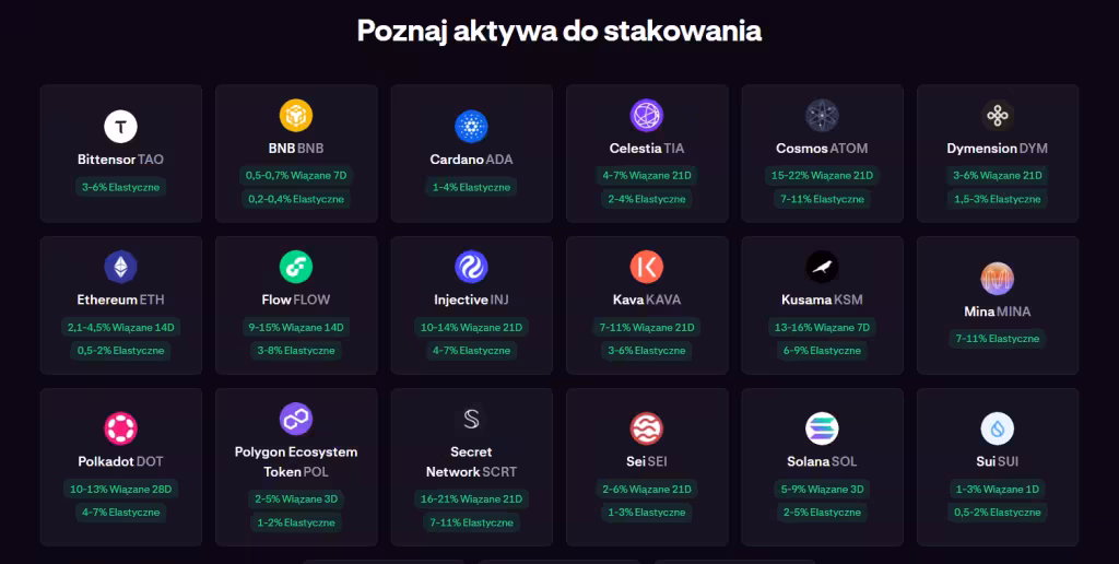 | ETH (Ethereum) | Wiązany 14D / Elastyczny | 2,1–4,5% / 0,5–2% |